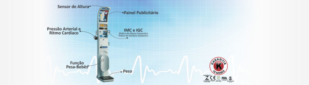 A Balança Multifuncional K6 é um equipamento de triagem de alta precisão, robustez e eficácia. Capaz de realizar aferições automáticas de Peso, Altura, Pressão arterial, Batimentos Cardíacos (BPM), Índice de Massa Corporal (IMC) e Índice de Gordura Corporal (IGC) por Bioimpedância, produz registros datados, resultados padronizados e possui certificado de calibração rastreável INMETRO.